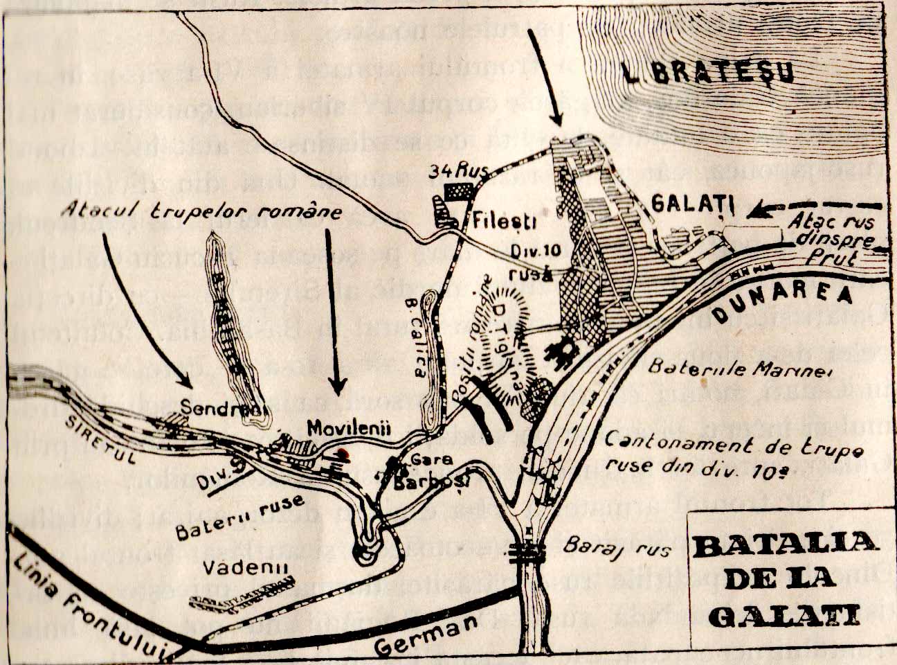 Situaţia trupelor de apărare a Galaţiului este mai mult decît dramatică. Ele sunt acum atacate din 4 direcţii: vest, nord, est şi sud. În oraş, trupele Diviziei a 10-a ruse se constituie în unităţi de luptă, fără a mai putea fi împiedicate de vre-o trupă română. Orice măsură pe care o ia armata română contrastează foarte tare cu diferenţa numerică între soldaţi. În acest moment, armata româna are o tresărire extraordinară de orgoliu. Din detaşamentul de la Fileşti se iau două plutoane de infanterie, o secţie de mitraliere, care sosesc în fugă. Infanteriştii români atacă cu o violenţă de neimaginat detaşamentul rus de la est, îl pune pe fugă şi-l urmăreşte pînă trece Prutul. Lucrurile iau o întorsătură incredibilă şi pe dealul Tiglinei. Mîna de soldaţi români care s-a menţinut pe linia a doua, ajutată de o companie din Regimentul 50, trece la contraatac. Susţinut pe dreapta de Detaşamentul Milicescu, sosit de la Fileşti (jumătate de companie), iar pe stînga de bateriile marinei şi a vedetelor de pe Dunăre, românii reuşesc să-l respingă pe celebrul lor inamic. Dinspre nord, are loc atacul principal, dat de trupele din Brigada a 8-a, sub comanda colonelului Bădescu, între lacurile Malina şi Calica, împotriva grosului Diviziei a 9-a ruse. La început, românii înaintează foarte greu, din cauza unui puternic foc de baraj al artileriei ruse. Dar bateria româna îi sustine. Vedetele marinei reuşesc să treacă peste barajul rus de torpile, fără nici o piedică din partea marinarilor ruşi. Ele bombardează din flanc poziţiile ruse. Cu toate acestea, situaţia era departe de a fi tranşată în favoarea noastră. Şi atunci, armata română face ceea ce a făcut dintotdeauna: atacul la baionetă. În frunte cu comandanţii lor, soldaţii români trec la un atac violent la baionetă, recuceresc dealul Tiglina, îi eliberează pe camarazii lor capturaţi şi-i pun pe fuga pe ruşi. Atacaţi şi respinşi dinspre nord şi est, ruşii intră în debandadă şi încep sa se îngrămădească spre sud, înspre Gara Barbosi, şi podul de peste Siret. Artileria noastră şi trei avioane de bombardament arunca bombe asupra masei de soldaţi ruşi strînşi acolo. Furia cu care românii, semnificativ mai puţin numeroşi, contraatacă, îi îngrozeşte pe ruşi, care iau o hotărîre disperată şi senzaţională. La ora 11:00 noaptea încep să treaca podul şi linia frontului şi se predau germanilor. A fost un deznodămînt total neaşteptat şi absolut unic în istoria primului război mondial. O bătălie între două armate aliate, în faţa poziţiilor inamicului şi sub privirile acestuia.