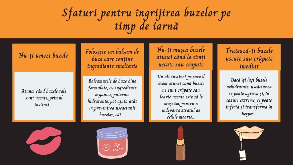 Balsamurile de buze bine formulate, cu ingrediente organice, puternic hidratante, pot ajuta atât în prevenirea uscăciunii buzelor, cât și în tratarea buzelor lezate de frig și crăpate. Optează pentru un produs de calitate, pe bază de petrolatum, glicerină și uleiuri naturale. De asemenea, dacă petreci multi timp afară sau îți plac drumețiile pe munte pe timp de iarnă, ai grijă să folosești un produs cu protecție solară pe față și pe buze, deoarece soarele, chiar dacă nu e la fel de puternic pe perioada iernii, tot îți poate afecta buzele, mai ales pentru că pielea acestora este foarte subțire.