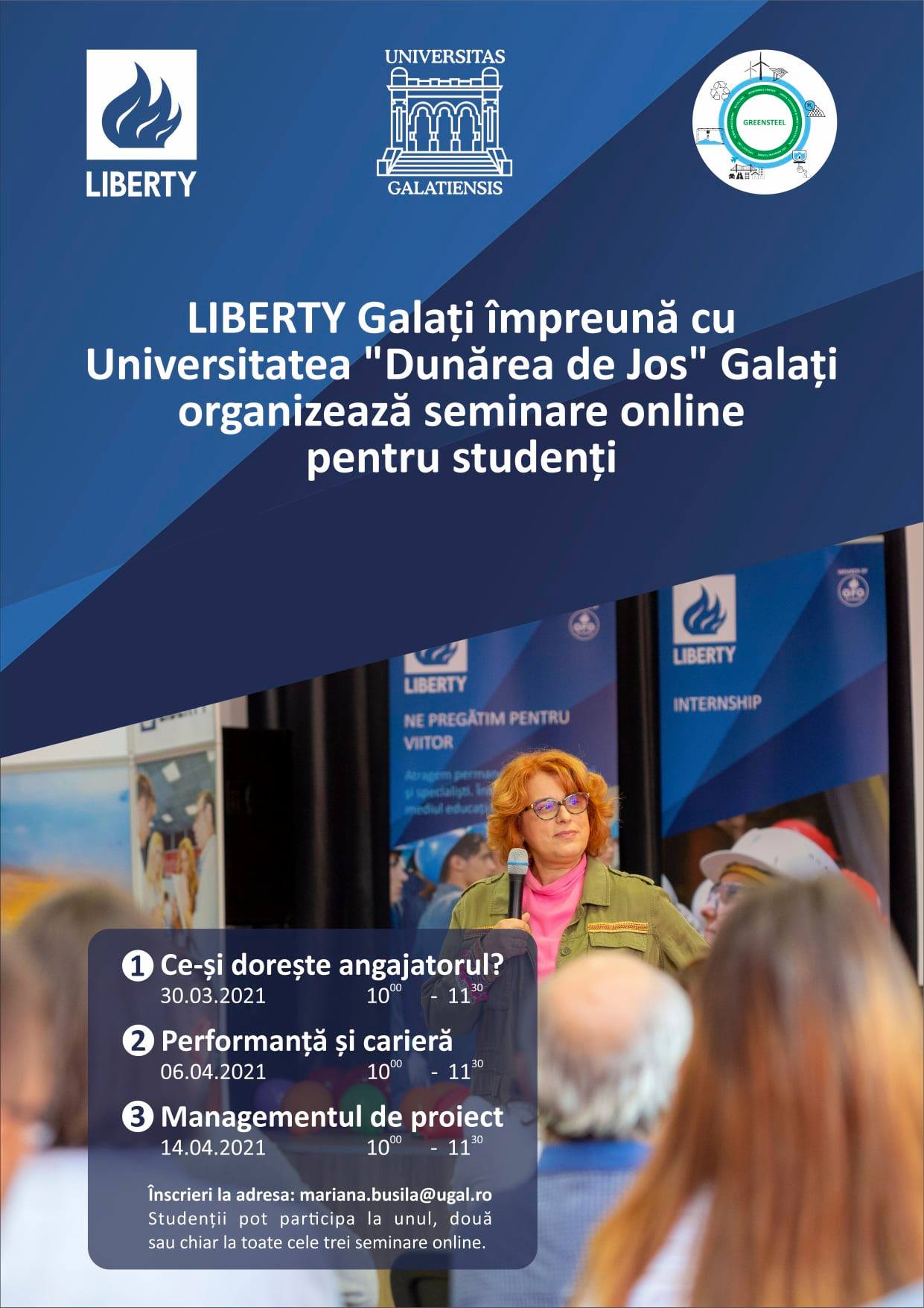 Liberty Galați organizează în parteneriat cu Universitatea „Dunărea de Jos” din Galați, în baza protocolului de colaborare Academia LIBERTY – GREENSTEEL, seminare gratuite pentru studenți. Seminariile fac parte din Proiectul P1 “Profilul inginerului de proces” responsabil Liberty – Ec. Mihaela Crăciun/responsabil UDJG – Prof. dr. ing. Daniela Buruiană și Proiectul P3 „Seminare Liberty” responsabil Liberty – Ing. Liviu Bogdan/responsabil UDJG – Prof. dr. ing. Daniela Buruiana