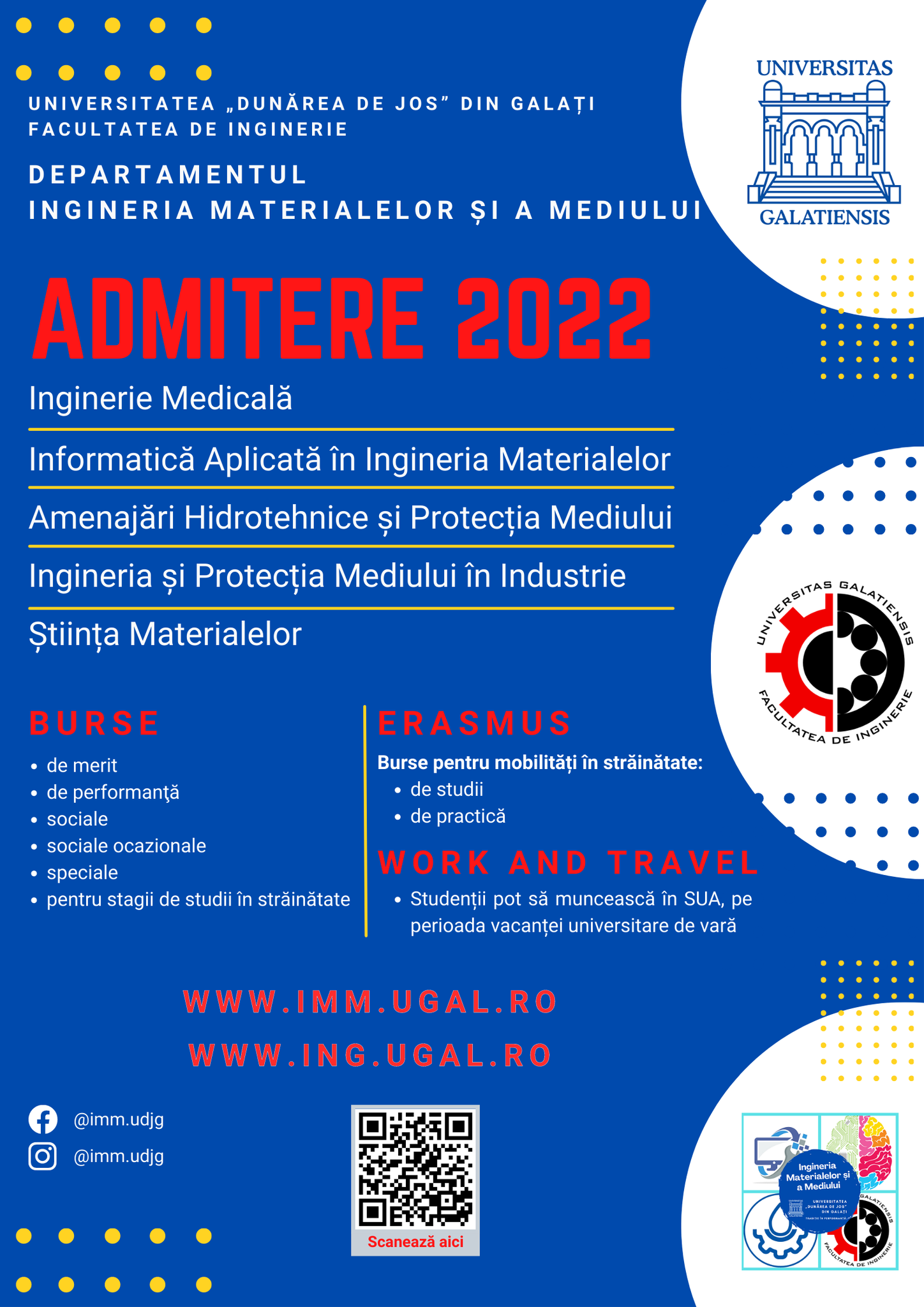Departamentul Ingineria Materialelor şi a Mediului, din cadrul Facultății de Inginerie de la Universitatea „Dunărea de Jos” din Galați, te așteaptă la următoarele programe de licență: