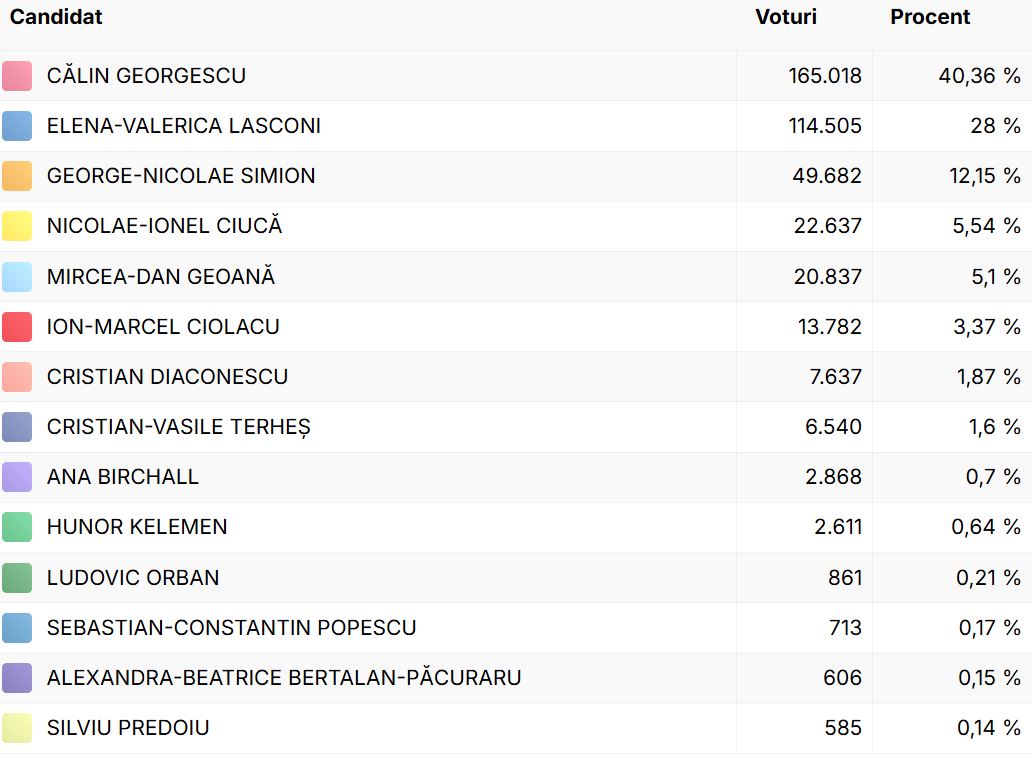- Călin Georgescu: 165.018 voturi (40,36%)