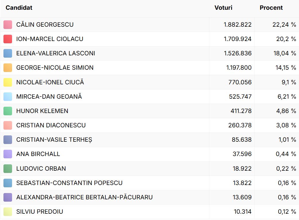 - Călin Georgescu: 1.882.822 voturi (22,24%) – menține poziția de lider.