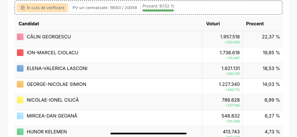 Rezultate partiale alegeri, dupa centralizarea 97,52% din secțiile de vot