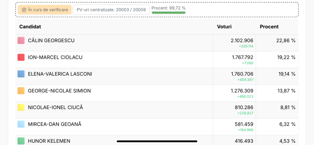 Rezultate partiale alegeri, dupa centralizarea 99,72% din secțiile de vot